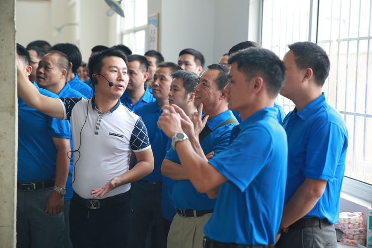羅志龍副總工程師與學員們在寶鷹建筑實訓中心交流樣板房的地板鋪設問題