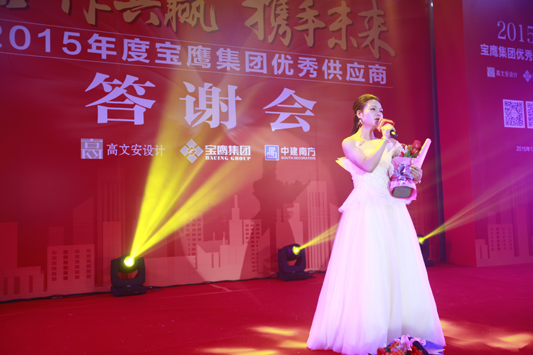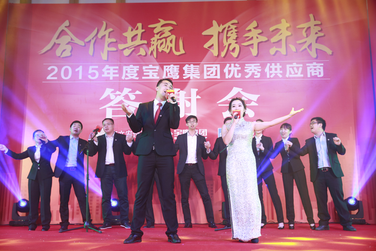 在諸位供應商與三方領導一起舉杯,滿飲此杯時,2015寶鷹集團優(yōu)秀供應商答謝會晚宴正式開始。一曲曲深情的歌兒唱出溫馨的祝福,一支支優(yōu)美的舞蹈跳出一個前程錦繡。熱鬧非凡的舞獅表演象征著紅紅火火,《今宵如此美麗》的曼妙歌聲讓諸位嘉賓流連忘返,《相親相愛的一家人》訴說著濃濃的情意,《大展宏圖》則傳遞出對未來的雄心壯志。參會嘉賓與諸位領導一邊觀賞著精彩的節(jié)目,一邊為友誼和新的希望舉杯,現(xiàn)場沉浸在一派活潑熱鬧的氣氛中。值得一提的是,本次供應商答謝會加入了嘉賓點歌環(huán)節(jié),諸位嘉賓分別用歌唱表達著自己心中的喜悅,亦為此次供應商答謝會畫上了圓滿的句號。